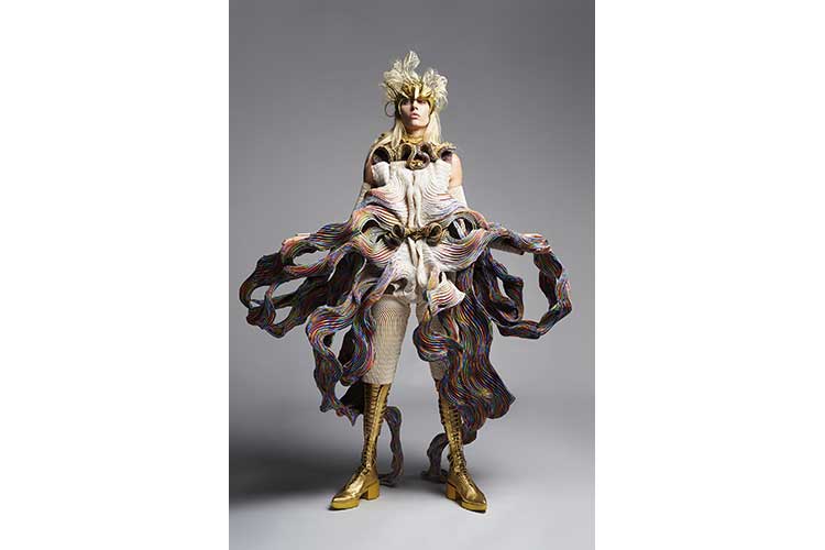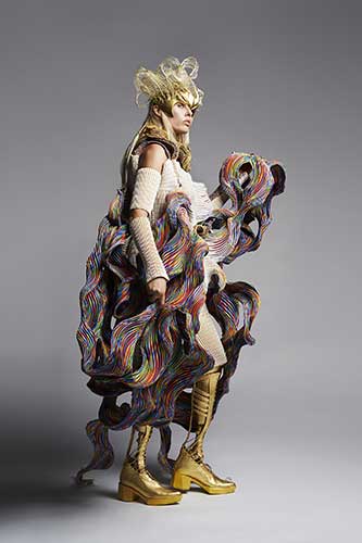 Il look è stato creato sfruttando varie tecnologie all'avanguardia. Applicando il nostro digitale proprietario tecnologia di trasformazione (Biosmocking) a un materiale proteico sintetico unico (Brewed Protein ™), abbiamo creato forme tridimensionali molto complesse che incarnano dettagli fisici di chi li indossa e che superano di gran lunga tutto ciò che potrebbe essere prodotto a mano. È importante sottolineare che, dato l'attuale ambiente globale, questo progetto è servito anche come dimostrazione della nostra capacità di creare pezzi personalizzati nonostante le sfide poste dalla distanza fisica tra il progettista e il cliente.