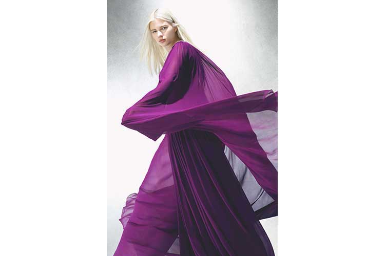 Audaci esplosioni di colori, volumi avventurosi e texture sicure si fondono in una varietà di silhouette che lasciano un'impressione straordinaria. Il rosso cardinale, il blu notte, il colore dell'uva, il lime e la lavanda sono la quintessenza degli abiti di seta lunghi e fluenti di ELIE SAAB. In un gioco sensuale di potere e romanticismo, la pelle grafica seduce il corpo nelle interpretazioni di giacca e gonna, mentre le volute ipnotiche ispirate al lime e al vino esaltano i look che abbracciano la figura.