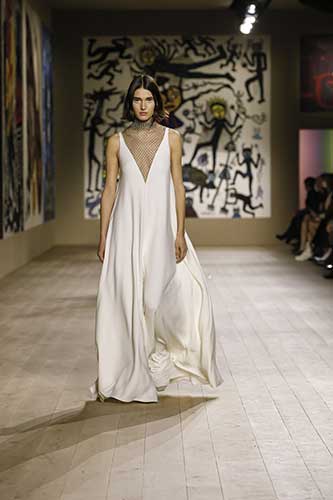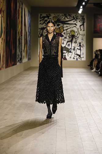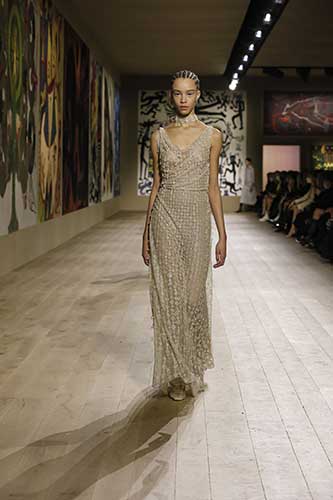 Questi motivi ricamati, attraverso i quali viene reinterpretato il patrimonio di Dior, diventano l'elemento centrale e, seguendo le regole della couture, vengono trasformati da una visione che fa dell'atelier una modalità di espressione collaborativa, dove l'Haute Couture è una forma di sperimentazione e messa in discussione costante.