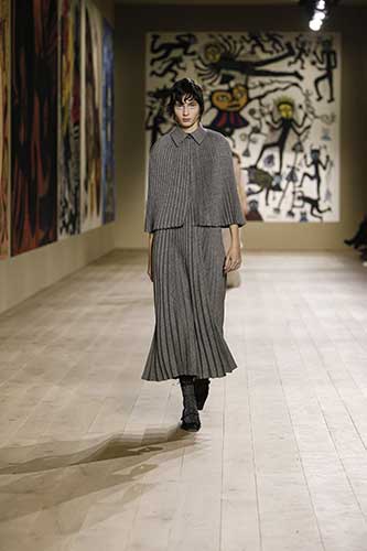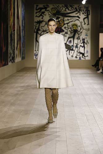 I cappotti di cachemire abbracciano la silhouette e mantelli eleganti in un bianco splendente nascondono insiemi di giacca e pantaloni. Gonne a pieghe si gonfiano sotto cappotti strutturati, mentre i tessuti jacquard in lamé argento degli abiti evidenziano ogni movimento del corpo.