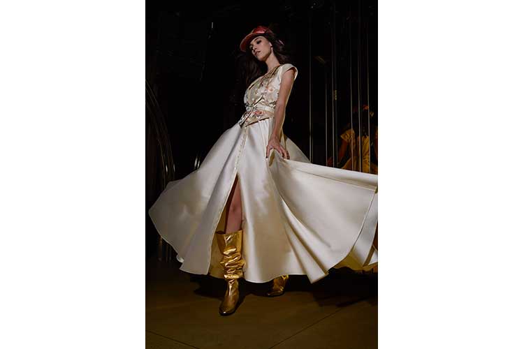 L’eleganza dei tagli sartoriali degli abiti incanta e i colori e i deliziosi ricami echeggiano con i loro riflessi che sembrano dar vita a forme immaginarie che si liberano nell’aria grazie alla leggerezza dei tessuti.
