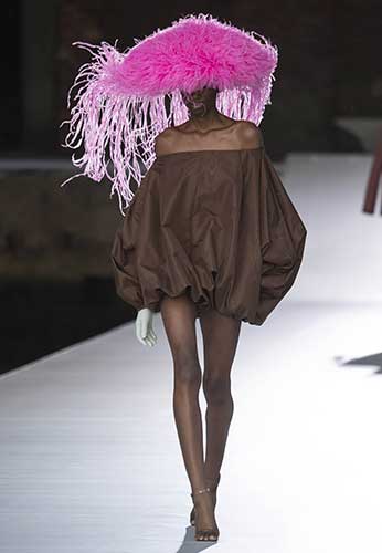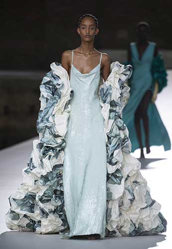 Questo processo sperimentale e metamorfico ritma e spazia una collezione che ricapitola i codici della Couture Valentino, dai cappelli fluttuanti ai ballgown grandiosi, caricandoli di vibranti segni cromatici, fluidificandoli nella noncurante casualità di drappeggi e movimenti.