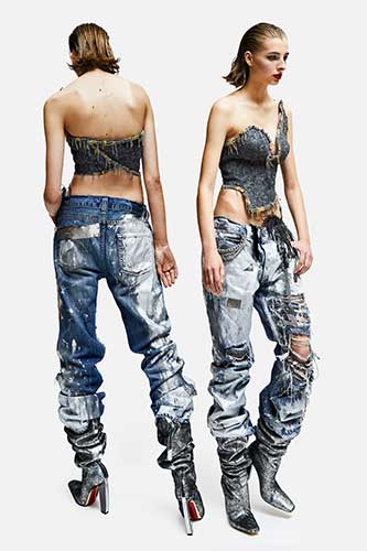 "Abbiamo utilizzato rifiuti tessili infeltriti realizzati con uniformi scartate sviluppate da "i-did", modellando un corsetto in un unico pezzo senza cuciture e rifinendolo con un bordo di catene di metallo avanzate ed intrecciate a mano.