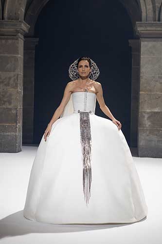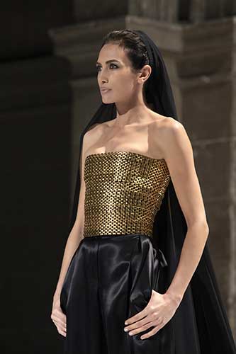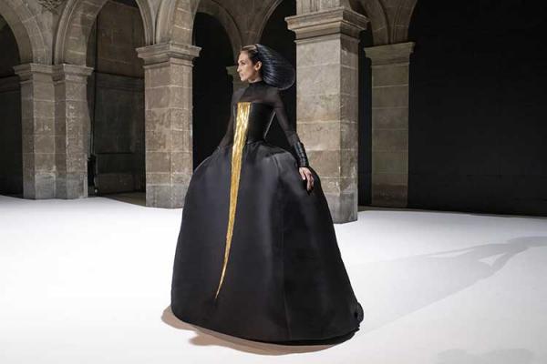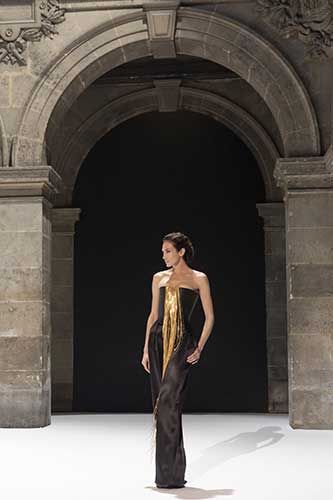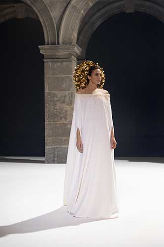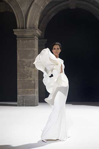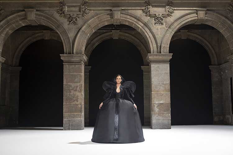 Gli abiti si aprono, sbocciano in un'atmosfera solare ma profonda. Il rigore iberico conferma una geniale solennità del taglio.