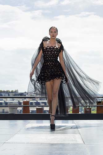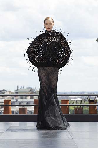 Una giacca realizzata con intricati tubi di velluto meticolosamente intrecciati con maniche in faille di seta a strati ha aperto la sfilata. Tema ricorrente in tutta la collezione, ogni fascia è modellata e adattata, e intrecciata a mano in elaborate spire, offrendo una sfumatura dell'aggraziato lavoro in ferro dei balconi parigini. Il pezzo forte di questa collezione Autunno-Inverno è un ballon scultoreo e dimensionale, creato con tubi di velluto filettati a mano e punteggiati di piume, che si libra come un guscio protettivo su un delicato abito di pizzo Chantilly.