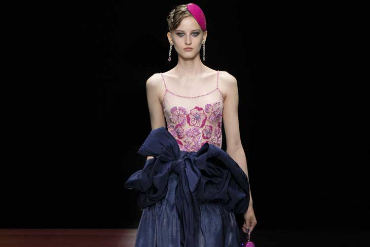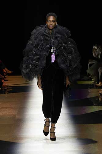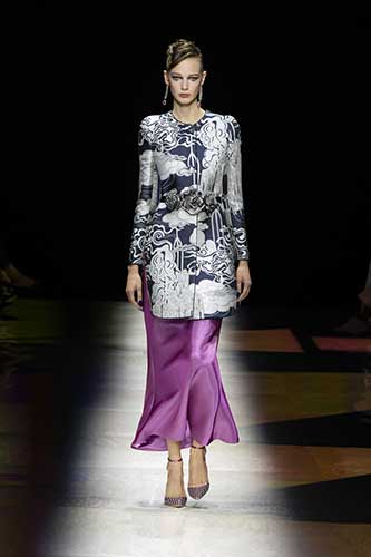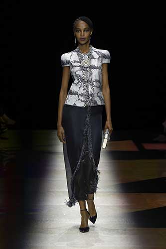Il realismo, tratto distintivo dello stile di Giorgio Armani, sempre filtrato dalla sua visione personale e interpretato attraverso un’arte raffinata, percorre una collezione che nasce dal bisogno di dare nuovo spazio allo scintillio, alla frivolezza, offrendo una via di fuga nel sogno e nella creatività.