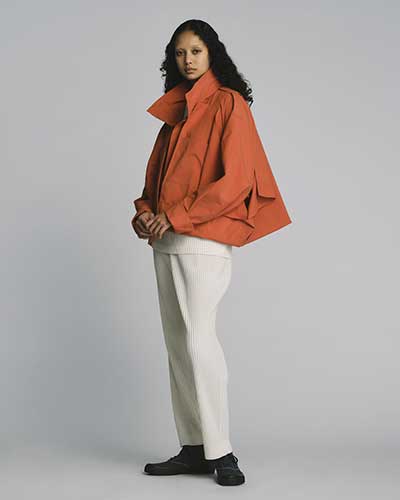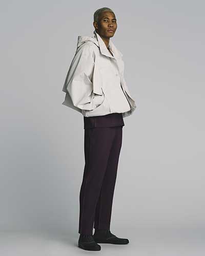 Questa collezione guarda ad una tenda, come una struttura composta di tessuto e un telaio, e adatta elementi della sua costruzione alla creazione di abiti. Il modo in cui si impegna a fare pieghe e grinze come a disegnare archi su una tela plissettata dà luogo a una nuova esplorazione di forme tridimensionali.