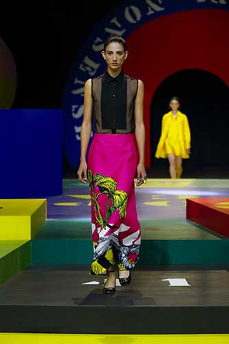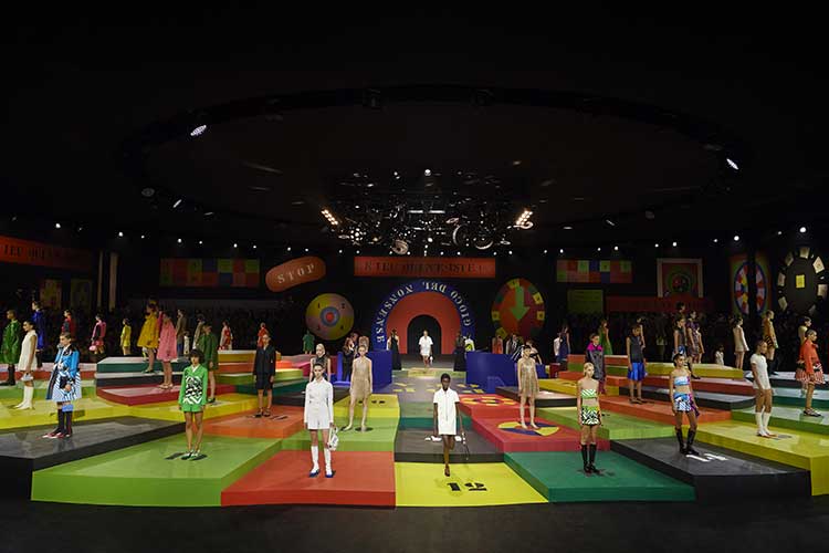 Questi colori simboleggiano anche le geometrie spaziali al centro dei giochi ideati dall'artista Anna Paparatti per mettere in discussione le regole dell'arte e della vita. Maria Grazia Chiuri si è ispirata ai suoi look singolari e ha voluto che concepisse la scenografia della sfilata come un "gioco dell'assurdo" che riflettesse lo spirito delle sue diverse opere .