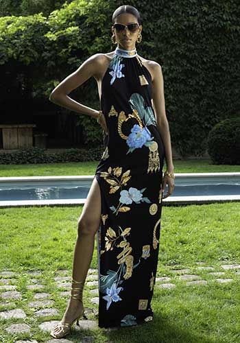 Stampe floreali di grandi dimensioni, sia prese dai vasti archivi della casa che introdotte di recente in questa stagione, sono disponibili in colori tropicali piccanti di mandarino, ananas, rosa punch e verde menta. Sono usati per creare abiti corti che mettono a nudo la pelle e terminano con una manica singola di organza abbinata, pantaloni in morbido jersey, cappotti strutturati che terminano con polsini di piume fluttuanti, minigonne sottili e abiti a maniche lunghe che si raccolgono in un cerchio che rivela l'ombelico. Tutti loro incanalano un'allure da jet set rilassato di fine anni '60, inizio anni '70.