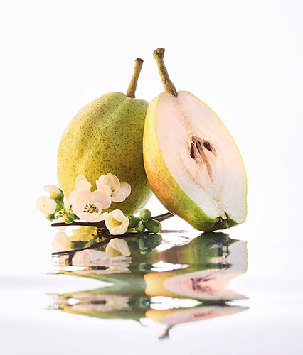 L’inattesa nota di testa della composizione è un gustoso accordo di pera, che risplende come un sorriso malizioso e irresistibile.