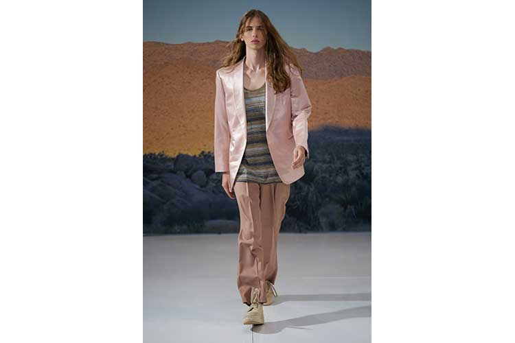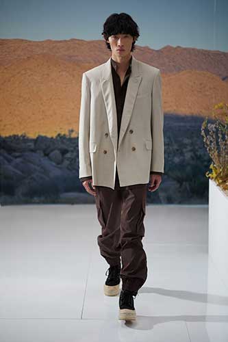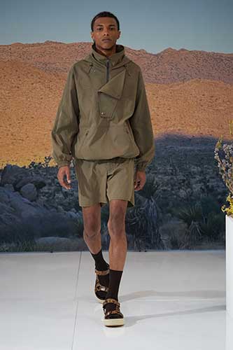 I plaid sbiancati dal sole (trama e motivo) ricordano le erbe secche che spolverano il paesaggio desertico, occasionalmente disturbato da macchie di bacche secche e fiori selvatici. Lino e seta alleggeriscono la sartoria tipica del marchio. Pelli e scamosciati si arricchiscono per rendere le caratteristiche terrose di Joshua Tree, mentre la maglieria ne cattura lo spirito bohémien offrendo reinterpretazioni delle icone del marchio: la polo open work si espande a camicie da campeggio con bottoni, cardigan, canotte e pantaloncini. L'epocale cardigan con palma e il maglione con palma nordica sono reinventati nei toni del deserto.