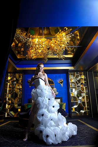 Matereza ci porta in un universo in bianco e nero tutto in seta francese. Increspature, fiori fatti a mano, abiti a mantella ultra aderenti; un'enfasi sul comfort e molto importante, sulla qualità della seta che è, per così dire, senza rughe.