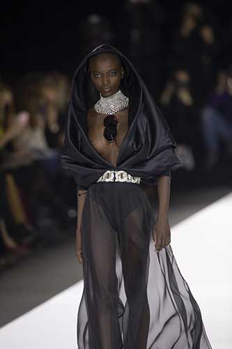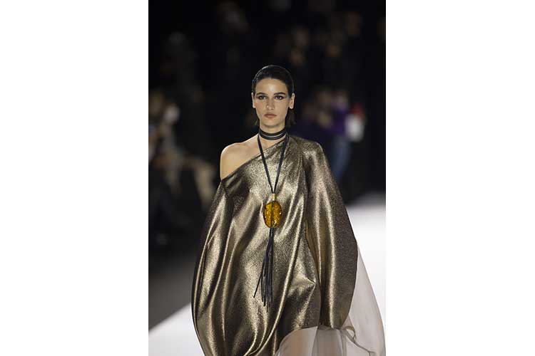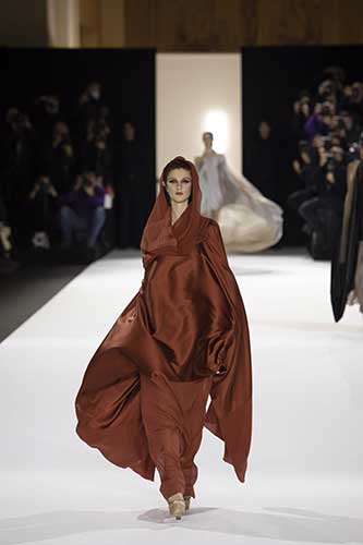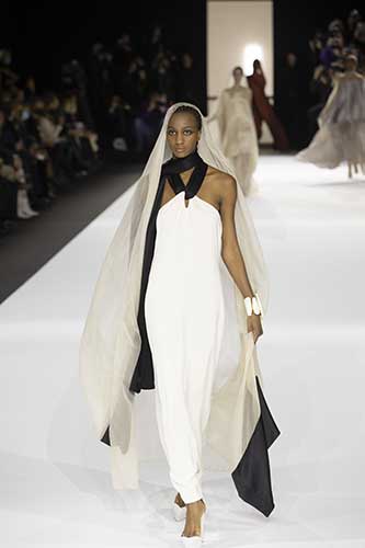 Le maniche accarezzano il pavimento, immense cappe drappeggiate e veli sulla testa aggiungono un po' di mistero, un po' di protezione. Arioso quanto impressionante, lo chiffon scivola e si muove su abiti toga drappeggiati.