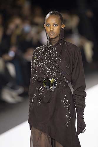 Una giacca sartoriale dai toni solari sfrega con una giacca tibetana in camoscio ricamato, avvolta come una coperta su un corpo. Le gonne sono fluide e trasparenti, leggere come l'aria.