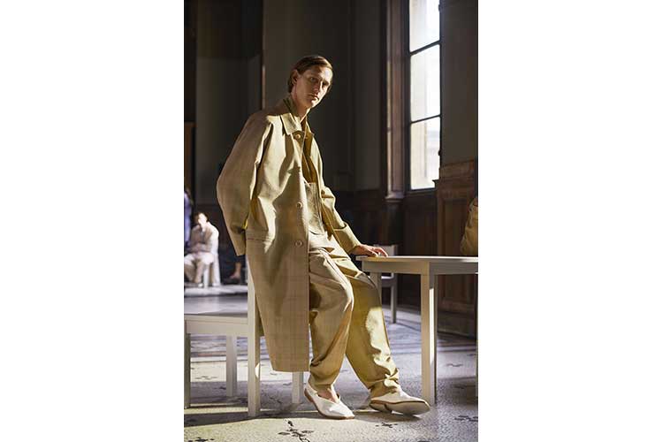 Il guardaroba estivo è più leggero, con camicie, abiti e pigiami morbidi e ariosi. I volumi generosi lasciano spazio al movimento. C'è spazio tra chi lo indossa e il capo, ma regolato in vita, alla caviglia, per strutturare la silhouette e proporre una raffinatezza quasi invisibile, un'eleganza disinvolta. I colli si allargano, compaiono maglie e nuovi tessuti, per una silhouette più leggera. Una certa patina e una fatica sofisticata avvolgono il corpo, senza intrappolarlo. Alle tonalità cremose si aggiungono sfumature di terracotta, una vena di rosso sangue, tocchi di zenzero, azzurro baby e rosa fresco creano una palette di colori freschi da giorno, contrastati da una stampa tropicale. Seta asciutta, seersucker, cotoni, danno vita a questa idea dell'abito come un amico, come una casa, con le finestre spalancate, o che ricorda un paracadute che corre sottovento.