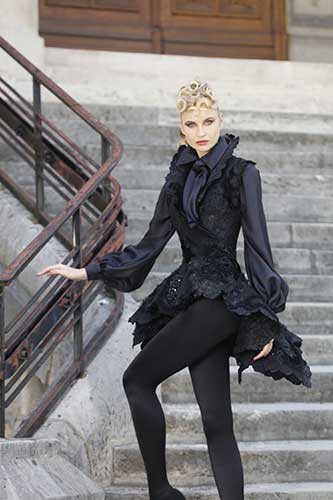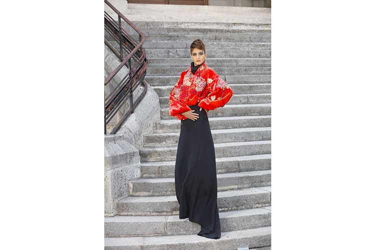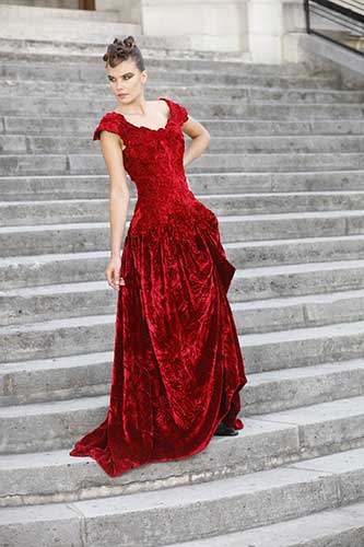 I ricami sono onnipresenti nelle guipure applicate, nel pizzo nero ritagliato, ricomposto e applicato su uno sfondo rosso o negli archivi della Maison Worth.