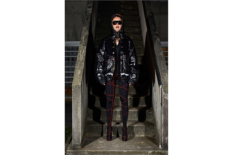 Il suo stile energico, come in questa collezione FW 2021, è conservato nei fili lasciati appesi alla fine della cucitura, il loro colore rosso spesso enfatizza il processo di trasformazione da indumento scartato a dichiarazione del designer.