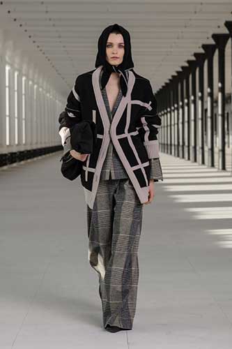 I materiali di alta qualità previsti come lana vergine, gabardine di lana, abiti a righe, alpaca, o cashmere Melton sono contrastati da materiali inaspettati e audaci come il morbido velluto in colore oro e argento, fodera stropicciata in argento e nero mescolata in un'imprevista struttura.