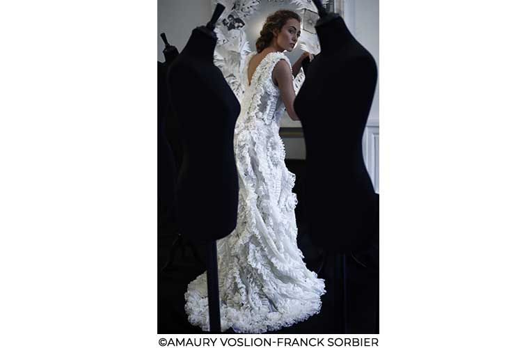 Catherine Wilkening indossa un bustier, una gonna e un cardigan lungo in organza di seta e metallo, drappeggiato, ridipinto, ritagliato, sfilacciato e ricamato con acqua e perle coltivate, fiori di pizzo metallico e fiori di organza di seta e guipure.