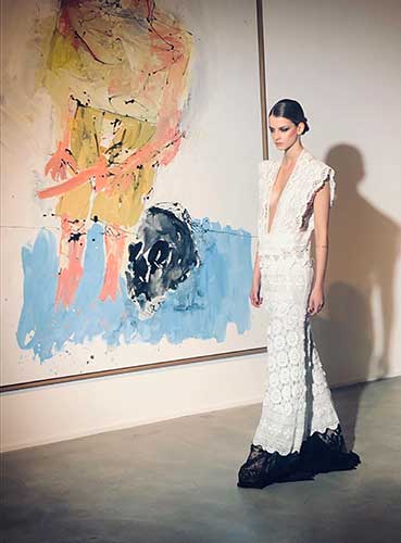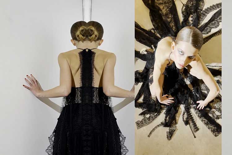 I modelli si trasformarono in ragni. La ragnatela ha ispirato un abito realizzato con 200 metri di pizzi diversi: pizzo di seta calais e chantilly fatto a mano mescolato a merletto a tombolo, tutte parti di un vero tesoro custodito pazientemente da Sofia negli anni. La pazienza è stata anche la chiave per creare un abito di pizzo bianco all'uncinetto, richiedendo abilità artistiche e savoir-faire nell'arte del ricamo per formare un pezzo unico che evidenzia la verticalità tipica di AELIS.