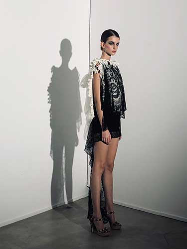 La ragnatela in pizzo, presente in tutta la collezione, copre un abito oversize scolpito sul corpo e trattenuto da un unico cinturino nero corvino, nonché un abito halter rosa fucsia in mussola di raso organico, entrambi imprigionati in pizzo di seta nero ed ispirati dai colori toccati dalle api.