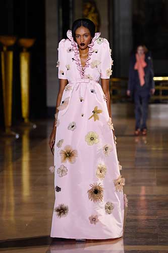L'unica decorazione si trova su un trio di abiti da sera lunghi fino al pavimento in bianco e nero, rosa pallido e nero. Ognuno è ricamato a mano in un'opera d'arte di fiori diafani e appassiti, eseguiti in ritagli di tessuto delicato, perline e paillettes.