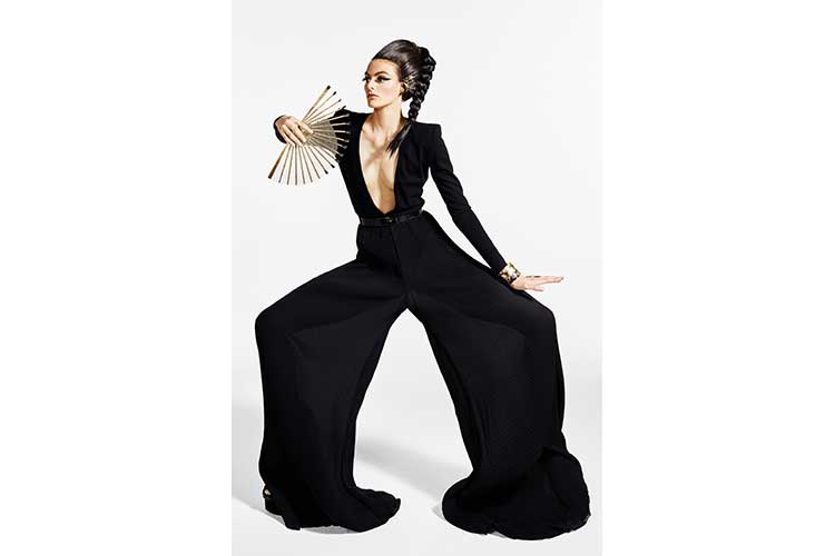 Look 19: Deep V-neck jersey body plisse palazzo pantaloni fan con maglia oro e cristalli Swarovski