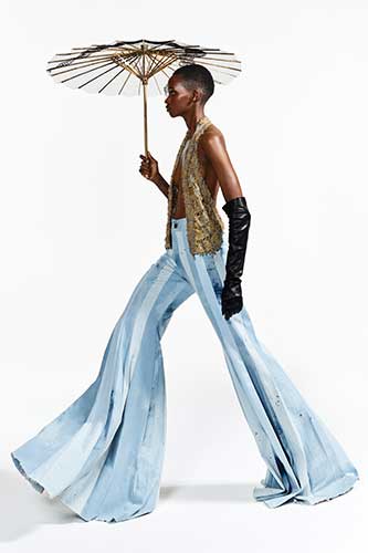 Look 5: Gilet di catena metallica intrecciata a mano a schiena nuda, mega jeans a campana da avanzi di denim riciclati, ombrello d'oro coperto con rete di seta e pizzo vintage con dettagli a forma di serpente guanti lunghi @ines guanti per RVDK.