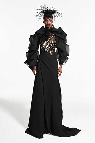 Look 24: Abito drappeggiato in plisse su base di garza di seta con maniche scultoree in garza plissé e volant con applicazioni in resina e foglia d'oro diadema piumato gancio per orecchie in resina e foglia d'oro.