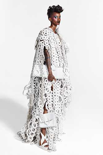 Look 34: Abito e cappotto a catena 'trashure' realizzato con taglio laser di feltro tessile riciclato varie borse da feltro tessile riciclato spazzatura feltro riciclato appendiabiti e catena.