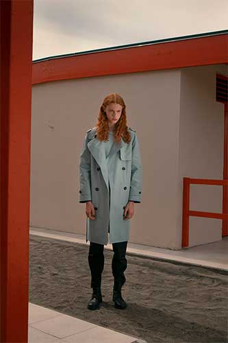 An example of this is the trouser in English pattern to be worn with a shirt that explores new cuts and with the trench coat in technical fabric, entirely heat-sealed and taped, where the only seams are at pocket height and for which only 3 cm of thread have been used. A true virtuosity in the construction of a garment.