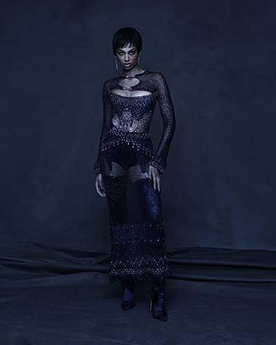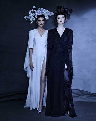I toni scuri e intensi ricordano le profondità della foresta. Le silhouette pulite con angoli acuti, ottenute attraverso il corsetto, sono un riferimento all'architettura snella delle antiche costruzioni in legno. Abiti trasparenti e fluenti con ricami elaborati confinano con capi più esagerati con spalle allargate, corsetti di pelle rigida e tessuti spessi.