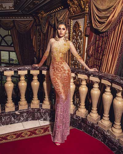 I materiali utilizzati in questa collezione sono stati principalmente seta, chiffon, oltre ai multicolori combinati nei ricami a mano presenti su alcuni abiti. Per quanto riguarda la location del servizio fotografico, Jean Charles ha scelto un luogo che ci ha riportato in un'epoca vintage mostrando potere e lusso attraverso le pareti dorate, i dipinti antichi e le sculture.