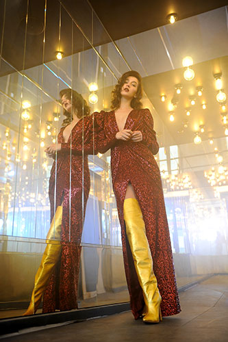 Il fuoco si mescola al velluto e alla mussola per il giorno e le paillettes appaiono per la sera in abiti lunghi e molto scollati.