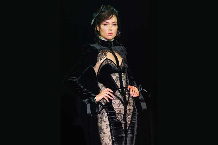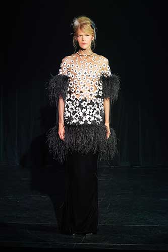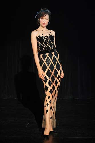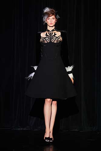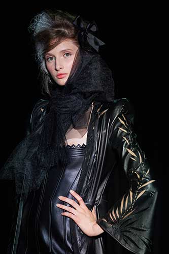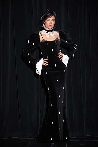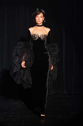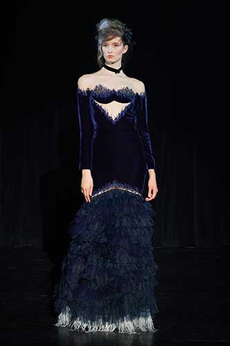 I colori e i tessuti ricordano il sublime giardino di Versailles in una notte incantata. Nero, blu, marroni, velluto di seta e rete grigia senza peso sono mescolati e abbinati a preziosi pizzi neri.