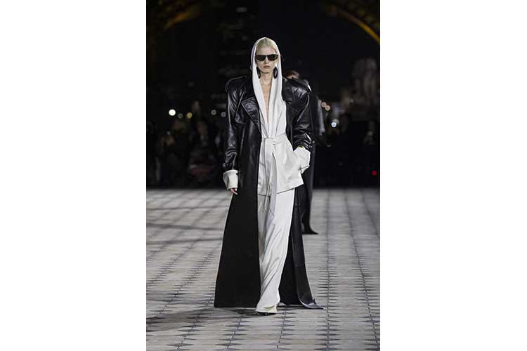 La collezione è caratterizzata da una fluidità radicale, espressa da maglie in jersey di seta. Gli abiti lunghi fino al pavimento sono caratterizzati da un'elegante disinvoltura, bilanciata da capispalla maschili che rappresentano la quintessenza di Saint Laurent by Vaccarello: cappotti di lana dalle spalle robuste, bomber e trench in pelle. I colori sontuosi e tenui richiamano i momenti più caratteristici di Saint Laurent, mentre le gambe sono nude ma nascoste da una silhouette a colonna. Un abito a canotta trasparente, pantaloni in cachemire e capi in raso ispirati al pigiama esemplificano la sofisticata disinvoltura che attraversa la collezione, accostata con effetto potente a gioielli scultorei in legno e oro.